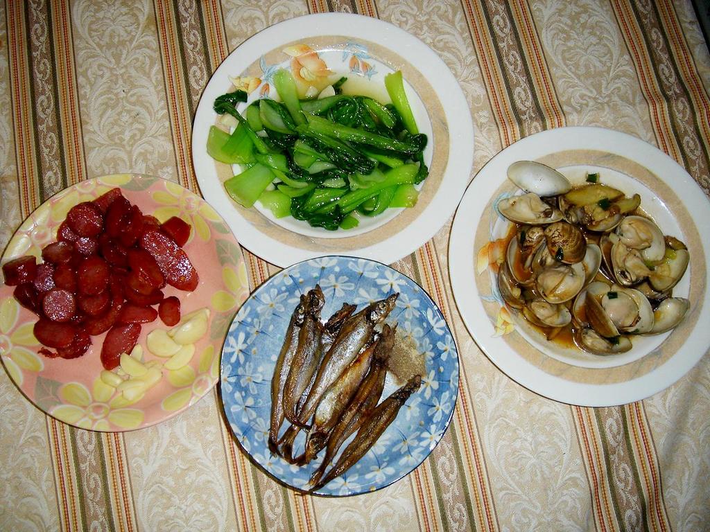 哈哈 今天晚餐很豐盛,我煮了四菜唷~~ yayaya好厲害喔,整個很開心^_______^ 煎香腸,炒蛤蠣,炸魚,青江菜