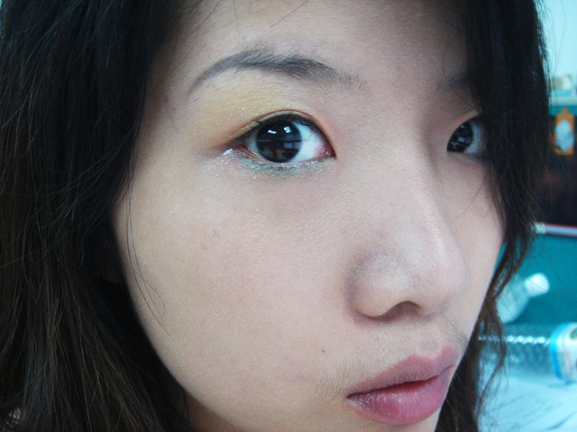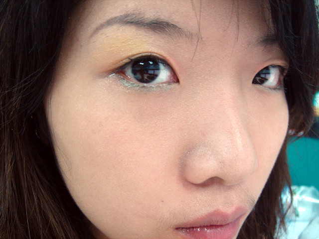 《糖果妝容百搭不膩》 使用金色眼蜜打底 亮黃色塗滿眼窩 MJ珊瑚粉紅抹在眼頭3/1處跟眼尾3/1處 MJ珊瑚海岸當下眼線 淡淡的彩色妝感 黃光燈光下的妝容 白光燈光下的妝容