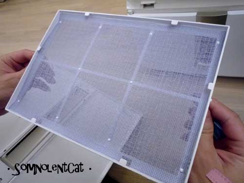 ▼ 拆下來看看...怎麼看都不像剛剛箱子裡的那張濾網...