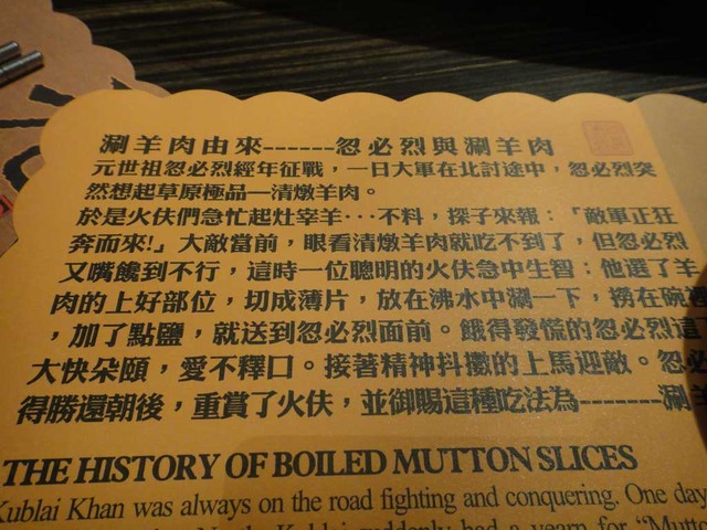 坐下來之後桌上的紙上面寫著涮羊肉的由來 ---