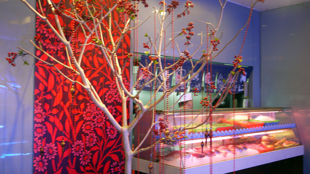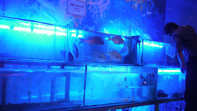 外面都會擺一些魚缸,裡面是最新鮮還活跳跳的魚類