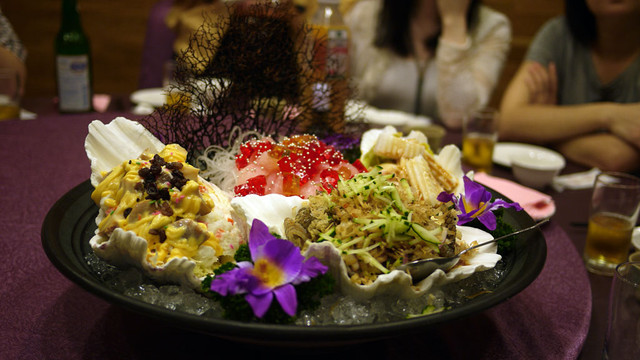 中間紅色的那些蒟蒻果凍跟銀色的糖球....覆蓋在生魚片上面.....