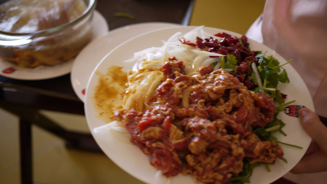 拿著這盤.....很多生肉、洋蔥、香菜跟辣椒的盤子...