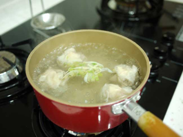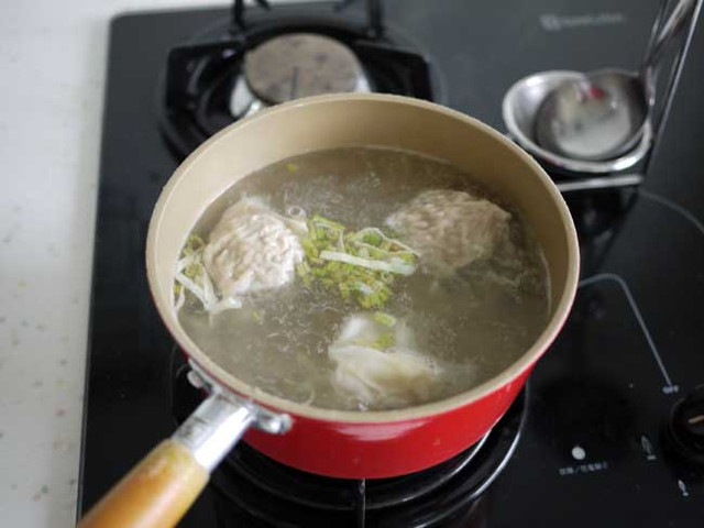 接著放入餛飩,四顆就很多了吧,這麼大顆...