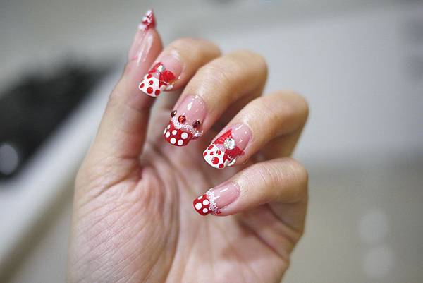在白色法式手指頭上印上紅色蝴蝶結,貼上水鑽點綴