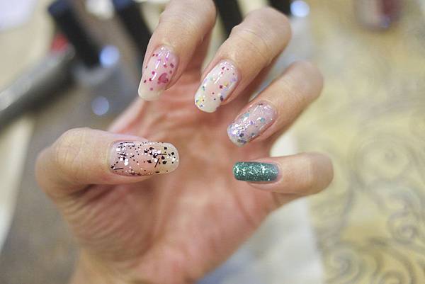 大拇指是#39,引起風潮的顏色,單擦一層就很美,碎片很均勻,怎麼擦都好看