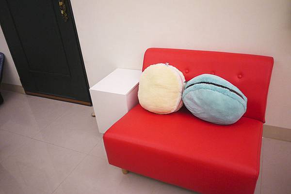 大門旁邊還有一個小沙發跟茶几,沙發上有兩個馬卡龍抱枕