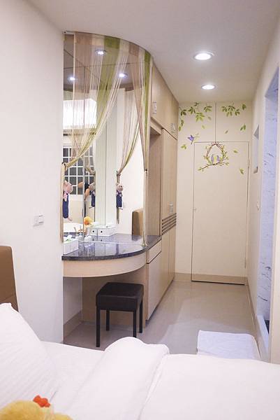 床的旁邊有一個小的化妝台,旁邊也有熱水壺