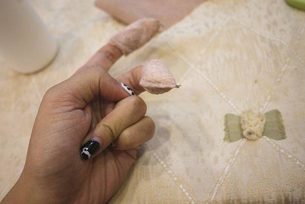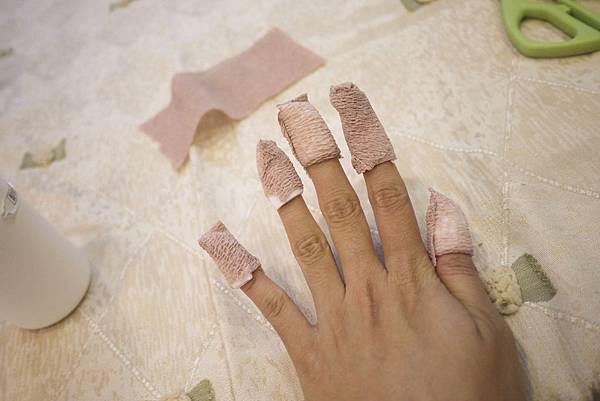 放上卸甲布,沾滿足夠的卸甲水,接著手指躺上去然後往下折,兩邊貼起來