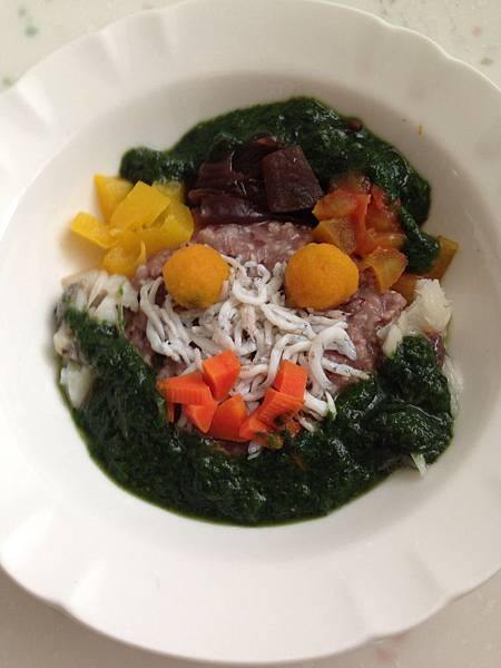 這是migi這幾天吃的鱈魚蒸蛋(內含鱈魚/菠菜/紅蘿蔔/山藥/百靈菇,不過菠菜大勝,其他顏色都看不到了)