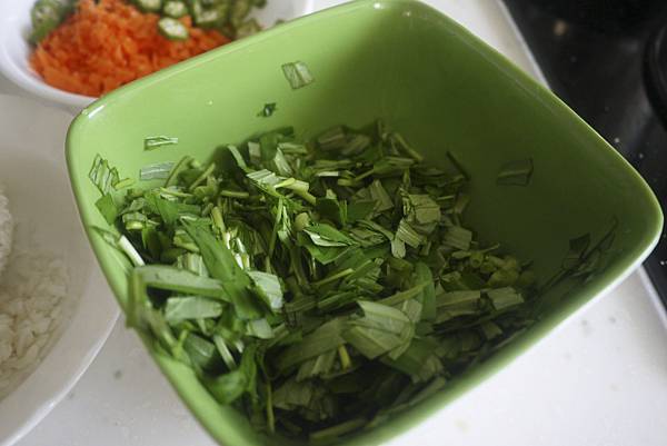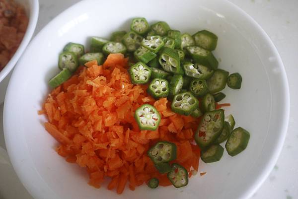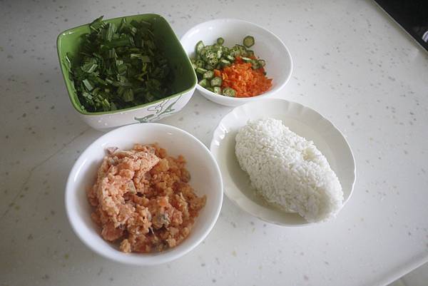 本次食材 - 鮭魚 / 空心菜 / 紅蘿蔔 / 秋葵 / 白飯