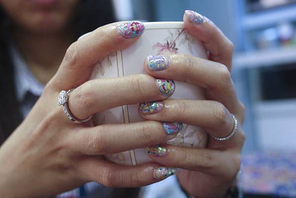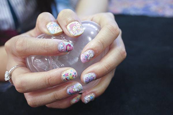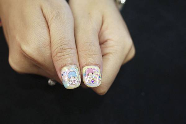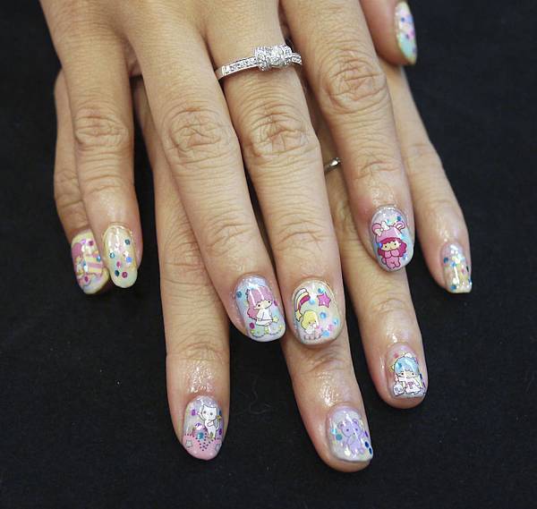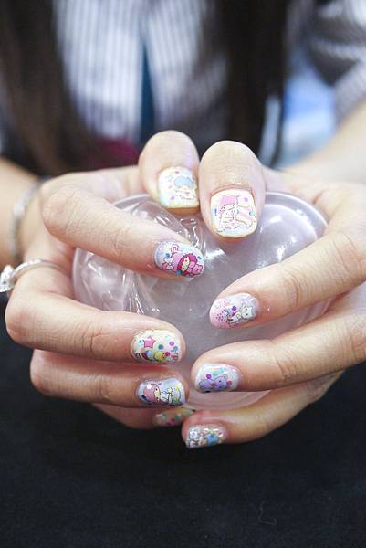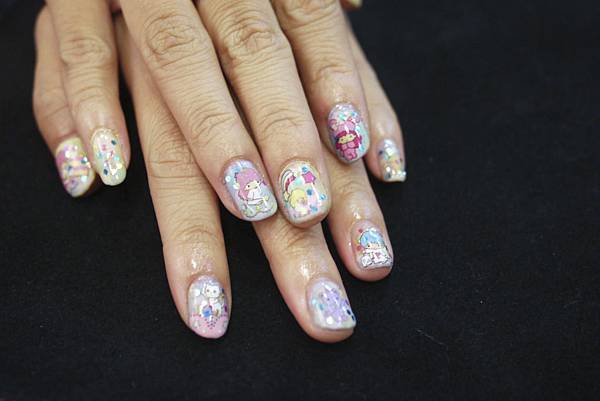使用粉嫩果凍色暈染當底色,接著用貼紙跟亮片