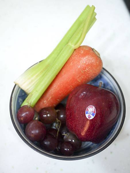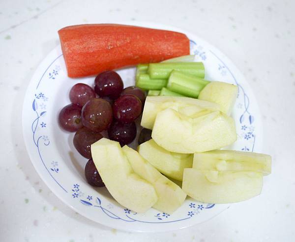 準備西洋芹(可以降血壓)、紅蘿蔔、葡萄、蘋果