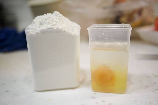 然後我做的是雞蛋麵,雞蛋跟水量好比例以後要記得打成蛋汁,整顆這樣的蛋黃是下不去的....