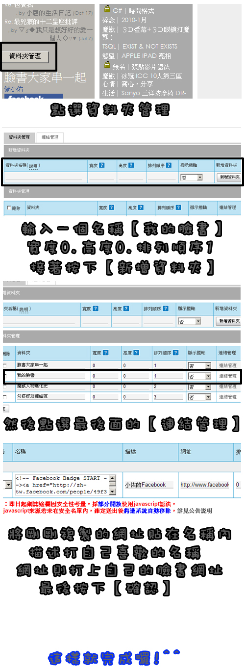 隨便輸入一個名稱-「我的臉書」,高度寬度都0,排序依自己喜好設定